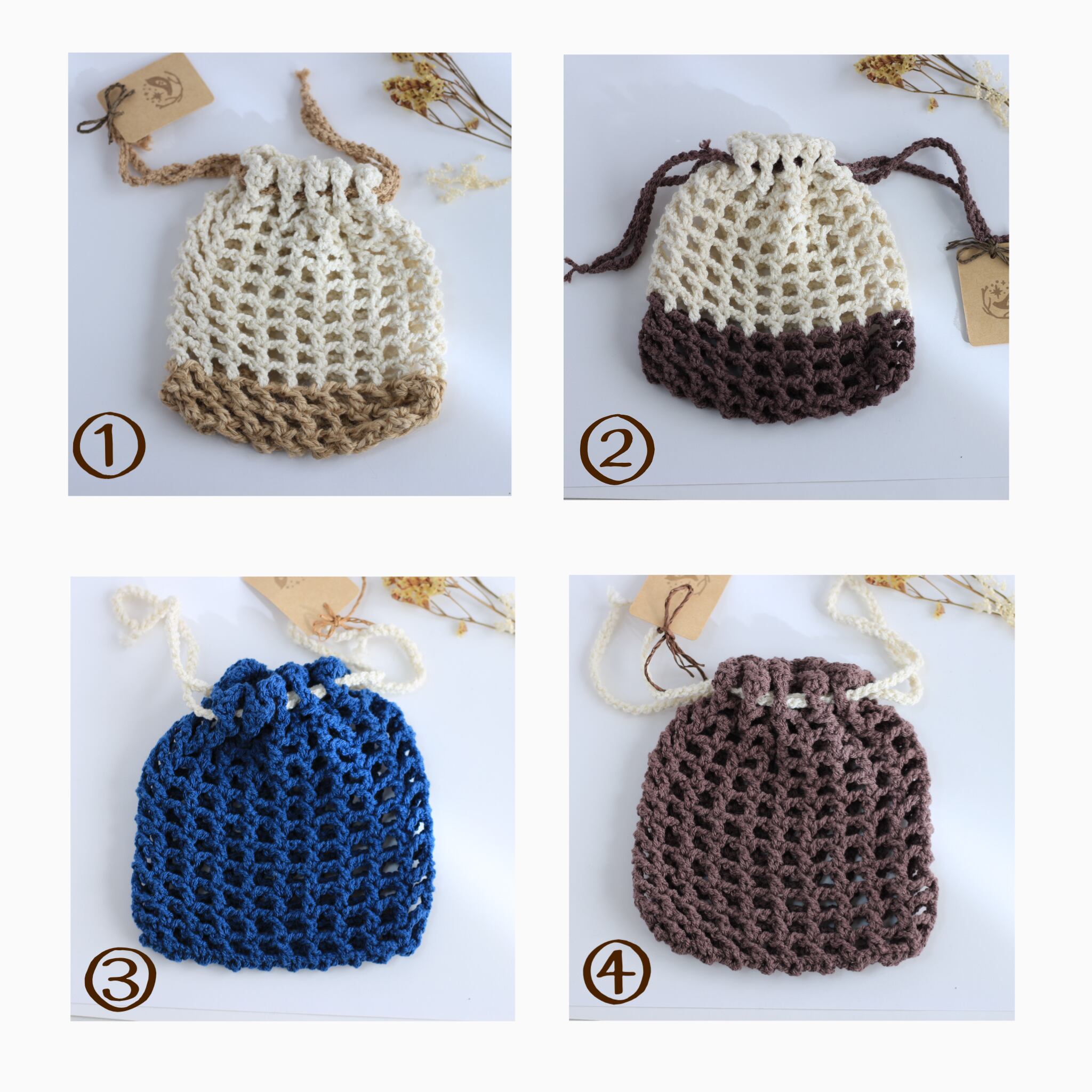 こちらはきんちゃくポーチになります!コットン糸を使用して繊細に編まれた透け感のあるデザインが特徴で、どこかナチュラルな雰囲気を楽しめます。軽やかな印象のこの巾着ポーチは、日常的に使いやすいアイテムです。
