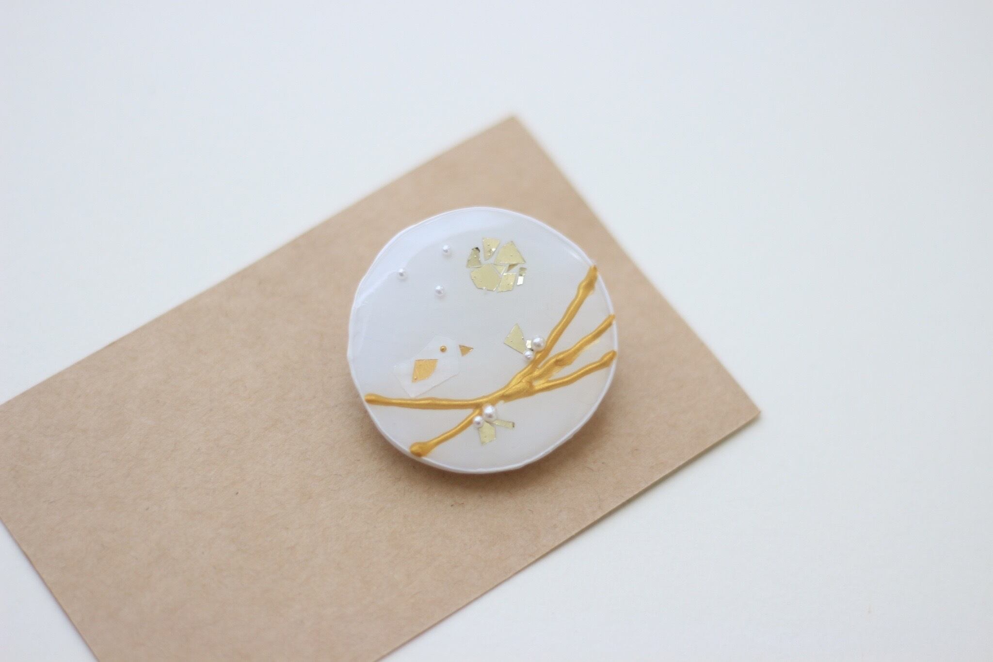 金色に輝く満月を眺める小鳥のまんまるブローチです。