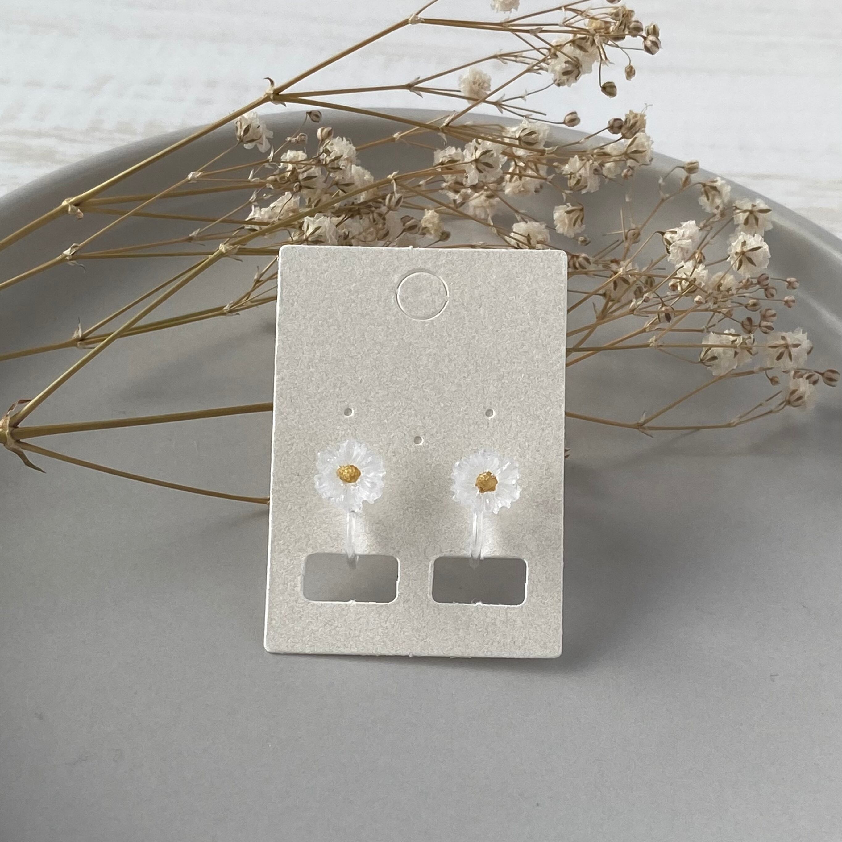 個々の花びらには、手作業で作られたリアルな質感があり、見た目も触り心地も魅力的。人目を引く存在感で、おしゃれのポイントとなること間違いありません。プレゼントにもおすすめです。大切な人へのギフトとして、または自分へのご褒美として、ほんのり白いコスモスノンホールピアスをお楽しみください。